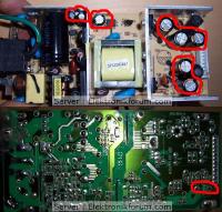 Ich habe dir mal die verdächtigen Elkos markiert. Der große auf dem Luxon steht ist meistens unverdächtig. Auf dem anderen Foto meine ich eine kalte Lötstelle zu erkennen, das Foto ist aber zu schlecht. Ich habe sie auch mal markiert.
