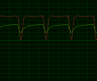 Dazu gleich ne Frage: Die beiden Kurven die ihr unten seht habe ich mit meinem Soundcard Oszi aufgezeichnet, und sind deshalb nicht besonders hochwertig. Die rote Kurve stellt die Spannung am Ausgang (PIN 3) dar. Die grüne ist die Spannung am Widerstand sprich der Strom durch die Spule (PIN 2 und 6). Man erkennt schön wie die grüne Kurve zwischen 1/3 und 2/3 Vcc mit Exponetialkurvenstücken hin und her hüpft.