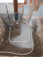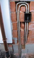 Die von links kommende Leitung ist im Haus mit der Potentialausgleichsschine verbunden und in der Revisionsklappe mit einer Anschlussfahne des Fundamenterders.