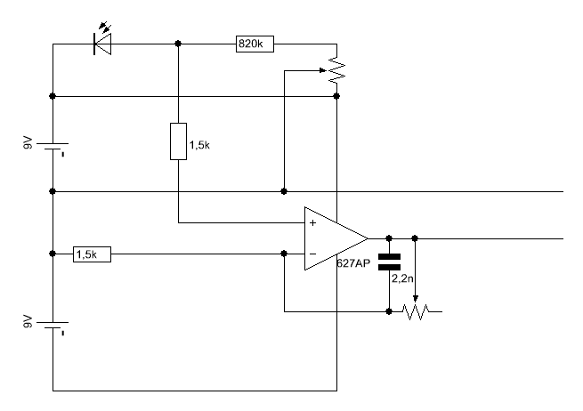 -Ich hab dann den OP-Amp ausgetauscht und siehe da ich habe vollauschlag am output, dass seltsame ist, dass ich den sowohl im beleuchteten Zustand als auch im unbelechteten habe. Da war ich schon mal ganz verwirrt und habe einen LM 7171 und einen nagelneuen OPA 637 ausprobiert und beide zeigen einen Ausschlag von 6.3V am Ausgang, auch wenn die Diode abgeklemmt ist und dadurch eigentlich ein unendlich hoher Widerstand anliegt. (die Batteriespannung liegt noch bei jeweils 8,5V.