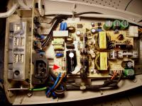 Wenn ich das auf dem Foto richtig erkenne sind da Brandspuren am Netzteil IC. Schau mal nach ob das evtl. explodiert ist (unterer Kühlkörper).