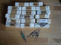 - 17 Schachteln alter Widerstände, teilweise Präzisionswiderstände 0,1%, Marke Dale Anzahl unbekannt aber die meisten Schachteln sind noch ca. halb voll. Alter unbekannt, geschätzt auf 1960. verschiedene Toleranzen von 0,1%-2%. Werte: 47R 56R 61,9R 110R 140R 240R 511R 604R 909R 1k 1,2k 1,62k 6,8k 7,5k 10k 13,32k 26,1k
