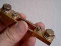 Der Leitung mit dem starken Strom wird an den Sechskantschrauben angeschlossen und an die Schlitzschrauben kommt das Voltmeter mit einer Ampere-Skala.