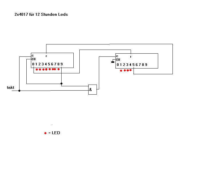 Hi Leute, ich bin dabei eine Uhr zu bauen. Die Minuten funktionieren ohne Probleme (pro Minute eine Led), aber mit den Stunden hab ich Probleme, Ich hab das alles mit 4017 aufgebaut. Um nun die 12 Stunden anzuzeigen (also pro Ausgang eine Led) wollte ich 2 4017 kaskadieren, im Datenblatt war auch ein Beispiel, aber nur mir dreien. Hab die Schaltung auf 2 4017 umgeändert, nun ist es aber so, dass nach der 8ten Led diese stehenbleibt, eine Stunde durchläuft und erst dann die 9te Led (am zweiten 4017) Spannung bekommt. Also kurzum: Wie kann ich zwei 4017 sauber ohne stocken kaskadieren? lg Luke