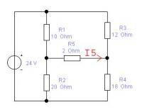 Geg: U=24V, R1=10Ohm, R2=20Ohm, R3=12Ohm, R4=18Ohm, R5=2Ohm