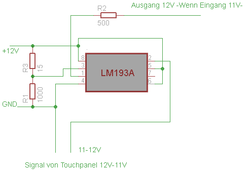 Deshalb Pin 3 auf 11,5V -> alles über 11,5V ist ein, alles unter 11,5V ist aus. Durch Vertauschen der Eingänge kann man den Schaltzustand des Ausganges invertieren.
