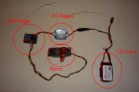Ich betreibe ein RC-Verbrennermodell mit einer 27Mhz Fernsteuerung mit Frequenzmodulation. Der Empfänger ist auf 4,8-6 Volt Spannung ausgelegt und da ich aus Gewichtsgründen mit einem 2-Zellen Lipoakku (7,4 Volt)fahren will, muss ich zwischen Empfänger und Akku einen 6 Volt Regulator hängen.