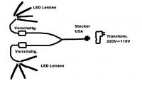 Wenn die Leisten sowieso mit 12V betrieben werden,kannst du dir den Trafo 230V -> 110V komplett schenken !