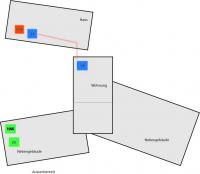 Da es alleine aus Denkmalschutz-Gründen am Haus nicht Möglich ist eine Zuleitung an der Hauswand bis hoch unters Dach zu legen und auch der gesammte Hof nicht wieder geöffnet werden soll, ist die Überlegung den neunen HAK direkt in der Nähe der Zufahrtsstraße in einem Nebengebäude unter zu bringen. In der Grafik grün dargestellt.