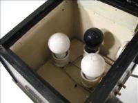 Zum Teil sieht mir das Ding verdächtig handgestrickt aus... und es dürfe sich in der Tat um einen (luxuriösen) Apparat zur Anfertigung von Kontaktkopien der damals üblichen Planfilmnegative und eventuell auch Platten sein. Mein Vater hat ein ganz ähnliches Gerät, aber mit nur einer weißen und einer roten Glühlampe und ohne Schalter und Zeitschaltuhr. Bei unserem findet ich innen noch ein Kontakt, der beim Schließen des Deckels automatisch die rote Lampe aus- und die weiße einschaltet um die Belichtung zu starten. Dürfte ähnlich alt sein, mit gedrehter Stoff-Netzleitung und (leider zerbrochenem) flachem Porzellan-Netzstecker.