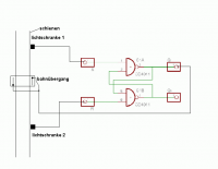 Zug schaltet L2 ein und wieder aus (ist am Bahnübergang vorbei ->fallende Flanke): Nach 5s gehen die Schranken wieder hoch; der Eingang des Schranken-Flipflops wird für 20s gesperrt. In der Zeit muss der Zug L3/L1 wieder erreicht haben. Ansonsten würde die Schranke ja wieder geschlossen. So ist die Schaltung erst wieder scharf, wenn der Zug wieder weg ist. Dann kann ein neuer kommen.