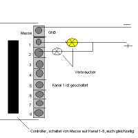 Auf der Skizze sieht man die Klemmbuchsen und ich möchte, wenn 2 nebeneinanderliegende Ausgänge (wie Kanal 1 u. 2) geschaltet sind, dass die Polung gewechselt wird, also z.B. der Verbraucher ein Motor ist dieser sich anders herum dreht.