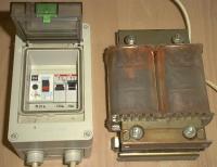 Der Automat H16A im Stromzählerkasten löste dann etwas schneller aus, vor dem C6A. Ich denke, so ist das gut. Ich bin so doppelt abgesichert in meinem Hobbyraum und habe auch noch einen FI. Der dicke Trafo im Bild ist als Trenntrafo beschaltet, hinter diesem befindet sich ein einstellbarer Spartrafo.