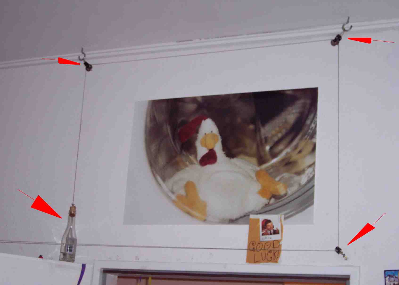 Da ist über drei Flaschenzüge eine Flasche mit Wasser angehängt worden.