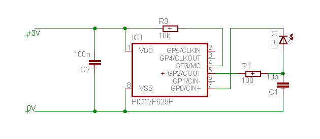 Theoretisch könnte der Kondensator gleich weggelassen werden, denn die Eingangskapazität des PIC ist in der gleichen Größenordnung. Das habe ich aber nicht getestet.