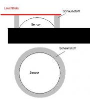 Die Fläche des Fotosensors ist ca. 12,5cm und ist Kugelförmig.Ausen herum habe ich einen Schaumstoffring geklebt, so das ich den Sensor direkt auf die beleuchtete Fläche legen kann und das er nach außen abgedichtet ist gegen Lichteinfall.