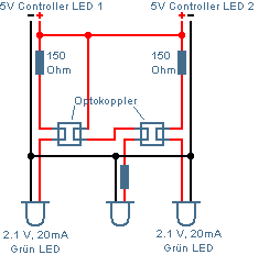 Deine 150R Widerstände sind etwas groß, da du an der Photodiode in den Kopplern auch etwa 1,2V Spannungsabfall hast. Dazu kommen noch etwa 0,1..0,2V des hier nicht eingezeichneten Schalttransistors im Laufwerk, sodaß deine LEDs bei der vorliegenden Dimensionierung wohl eher mit 10mA betrieben werden.