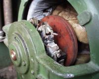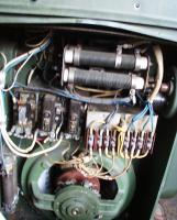 Wie das Gerät normalerweise erregt wird weiß ich leider nicht. Die 4 Anschlüße des Erregerknopfes haben auch keine Spannung(12 Volt von Batterie). Diese große, äussere Wicklung des Generators hat oben mehrere Abgänge mit relativ dicken Kabeln die zu Sicherungen gehen(Bi-Metall). An der Unterseite kommen auch zwei etwas dünnere Kabel aus der Wicklung die auf zwei Fingerdicke Kondensatoren gehen. Die andere Seite der Kondensatoren geht auf die Bürsten.